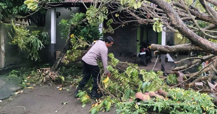 Bhabinkamtibmas yang menerima laporan warga langsung menuju lokasi dan berkoordinasi dengan Lurah serta Kepala Lingkungan setempat. Bersama warga, petugas bahu membahu melakukan evakuasi dan pembersihan batang serta dahan pohon yang tumbang.